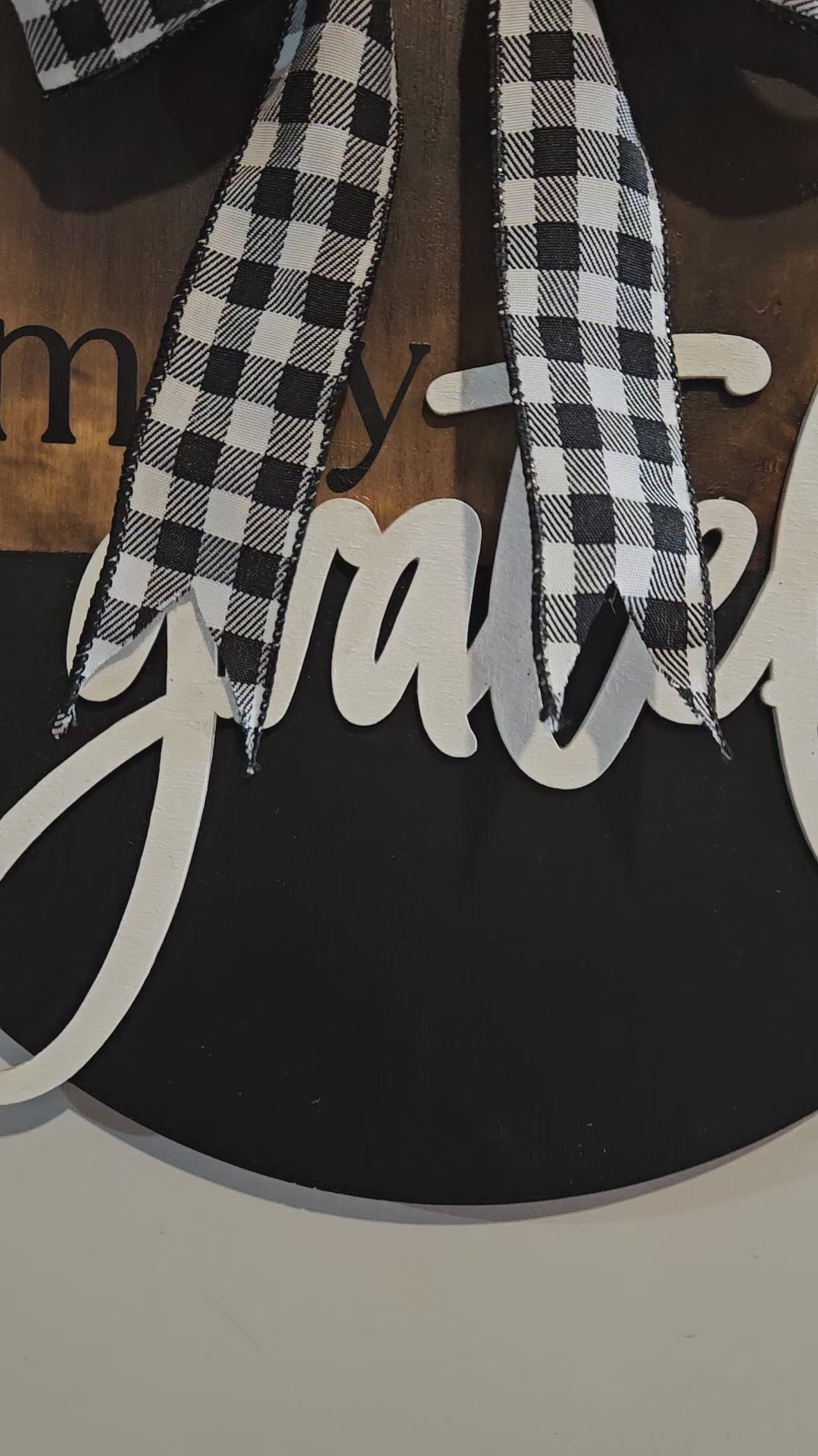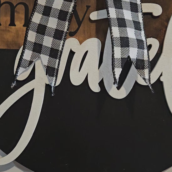 12" Circle Wood Sign with JMR Design "Simply Grateful" W/ Checker Ribbon Bow