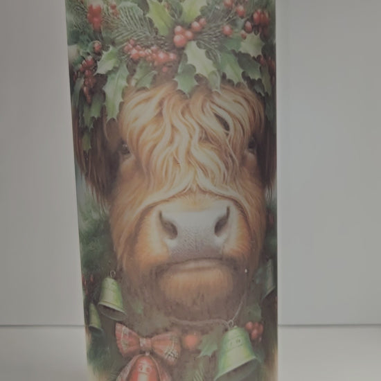 25 oz Frosted Skinny Glass Tumbler "Christmas Highland Cow"