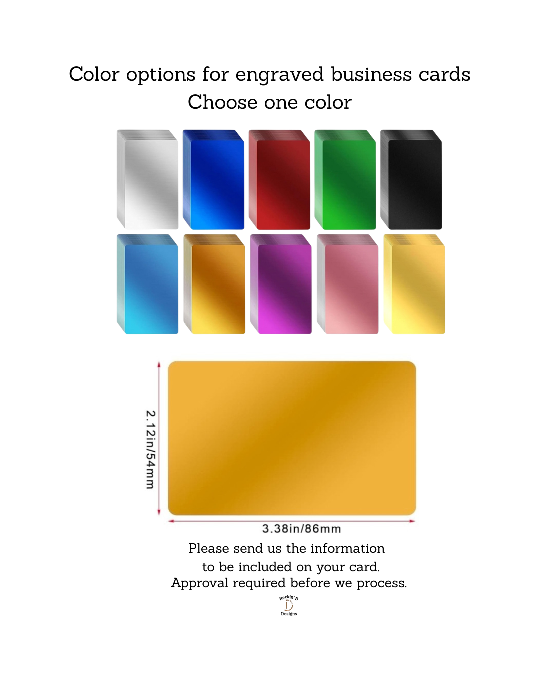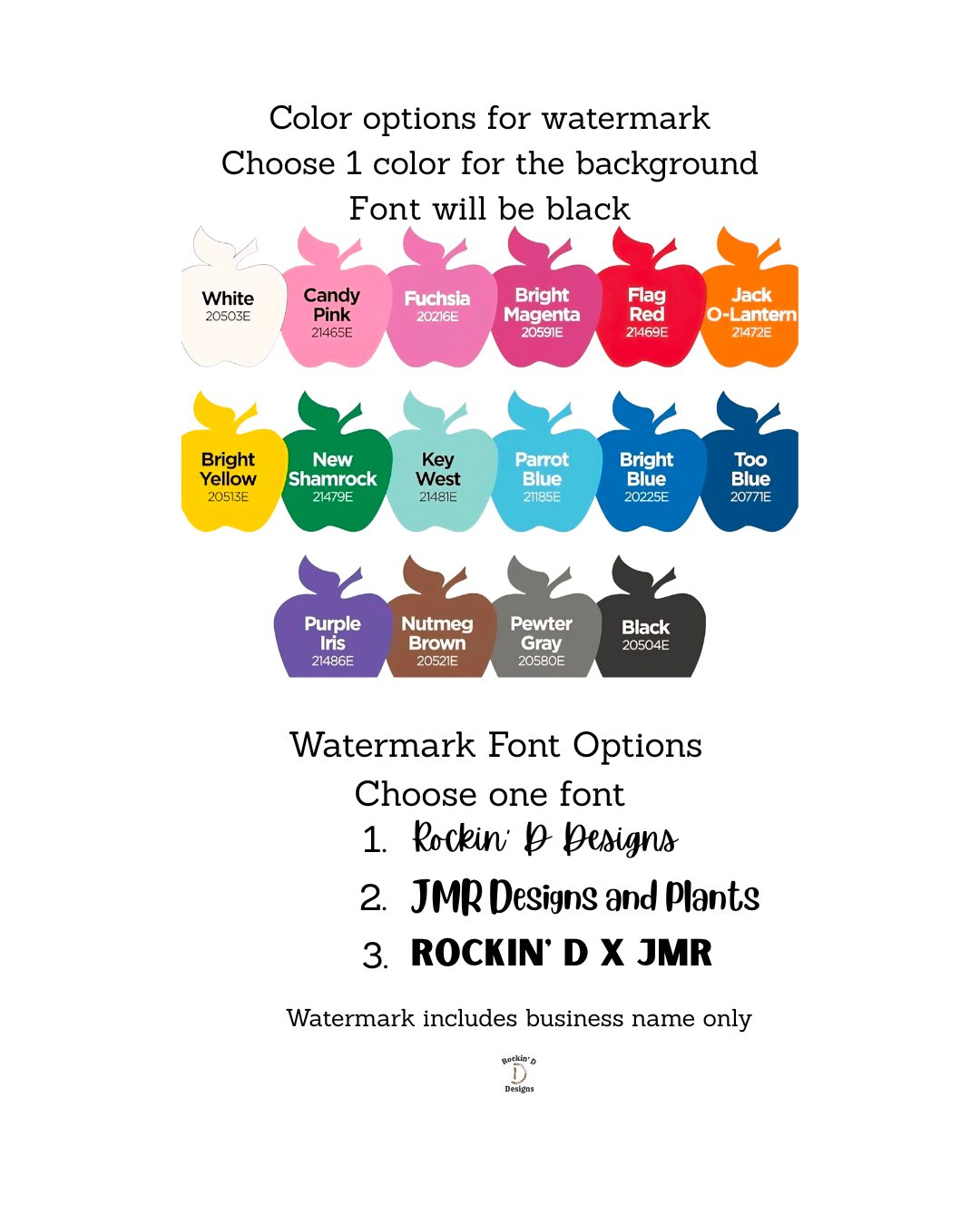 Please email jmrdesigns079@gmail.com or rockinddesigns@gmail.com with your desired logo, company name, and your choices for your purchase.
